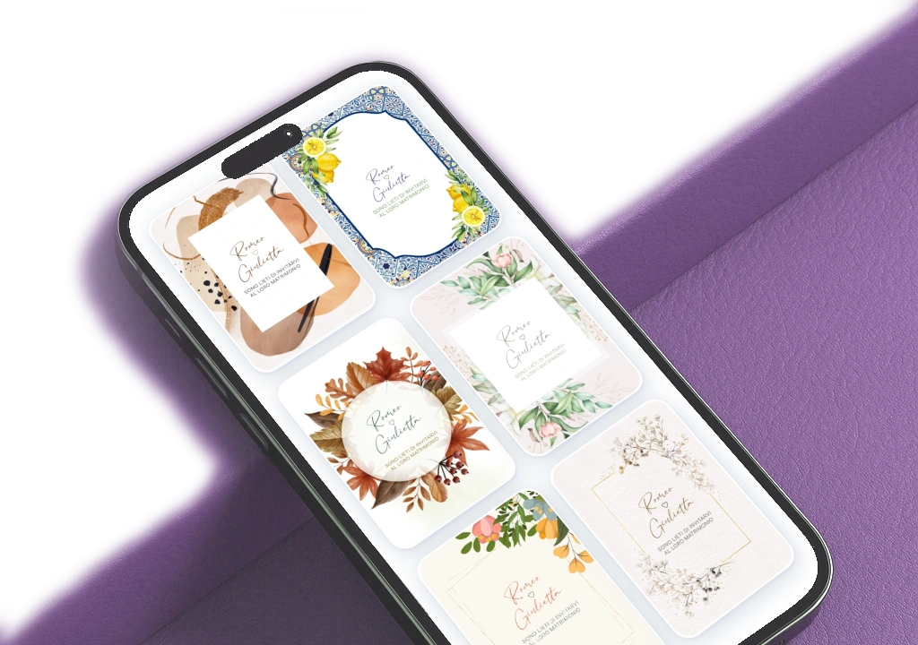 Esplora la nostra collezione di inviti digitali personalizzabili per matrimonio, compleanno, battesimo, laurea e altri momenti speciali. Ogni tema combina un design unico con funzionalità interattive pensate per rendere l’esperienza degli invitati semplice e coinvolgente: conferma di partecipazione (RSVP) online, indirizzo completo con pulsante che avvia la navigazione in Google Maps, contatore dei giorni, promemoria dell’evento da aggiungere al calendario, informazioni su servizio navetta e parcheggi, instant gallery per condividere foto in tempo reale, possibilità di mostrare un videomessaggio, dettagli su soggiorno e lista regali, indicazioni sul dress code e molto altro.
